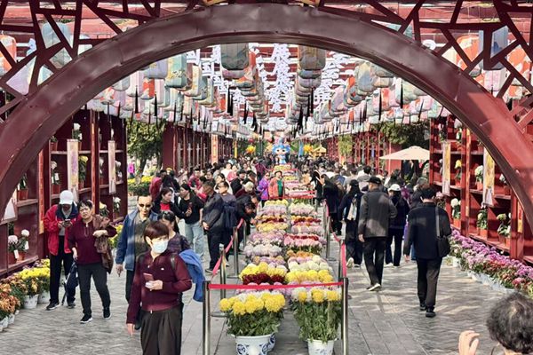 11月4日,开封龙亭公园内,游客们在观赏菊花展。