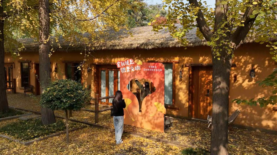 在滑县枣村乡堤上村白马林谷银杏小院,金黄的银杏叶在阳光下熠熠生辉,游客漫步其中,宛如步入金色画卷,纷纷驻足拍照。非遗文创体验区内,传统技艺展示与特色农产品展销让游客在互动中感受传统文化魅力,实现“赏景、品文化、购特产”有机融合。(席瑞娜/文 任嘉伟/图)