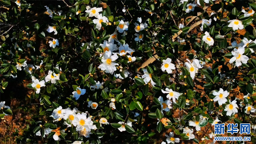 11月5日,在信阳市新县新集街道冲田洼村大别山油茶文化公园,油茶花开满枝头。(王玉新 摄)