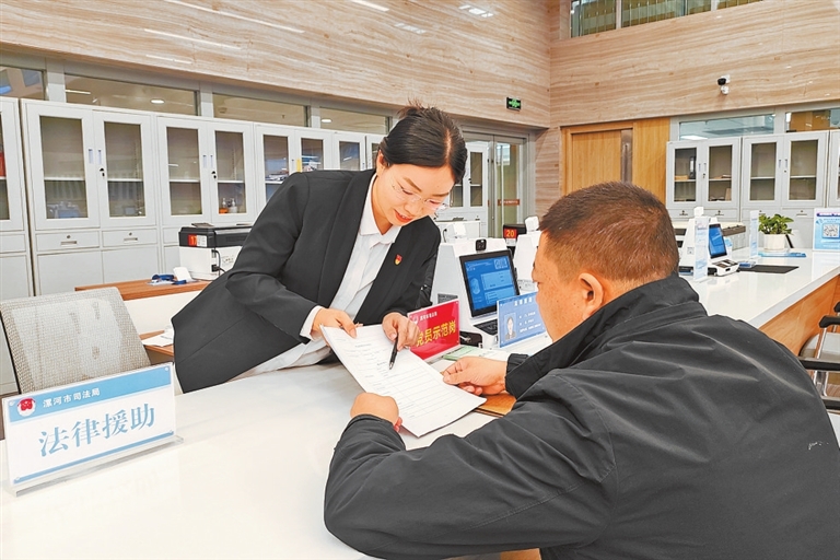 漯河市司法局驻漯河市政务服务中心窗口工作人员指导当事人填写法律援助申请材料。郑彦君 摄