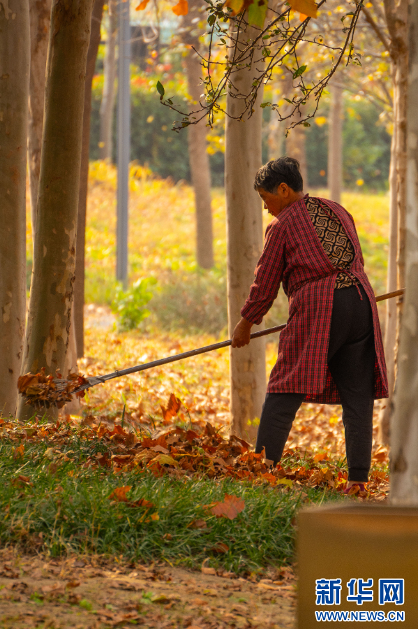 阿姨挥动扫帚 轻轻拢起满地的秋意