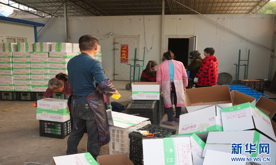 11月16日,在南阳市桐柏县程湾镇艾庄村一处香菇种植基地,农户将完成分拣的香菇装箱,等待发运。高阳 摄