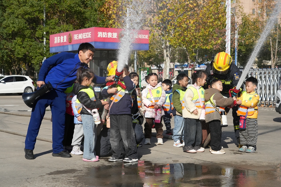11月20日,在南阳市宛城区,孩子们在消防员的指导下体验消防水枪。(王浩 摄)