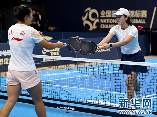 9月25日,2025全国匹克球锦标赛在河南省鹤壁市开赛。图为四川李宁代表队球员泽仁娜姆(右)在比赛后与对手碰拍致意。新华社记者 郝源 摄