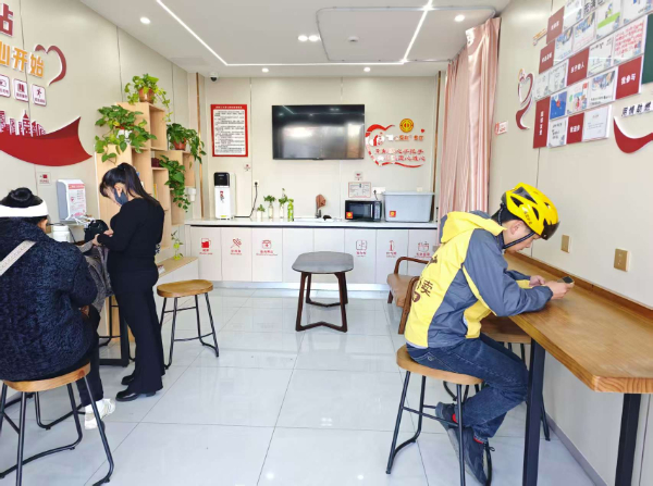 图为外卖员在固始县中山大街幸福社区“爱心驿站”休息。(固始县委宣传部供图)