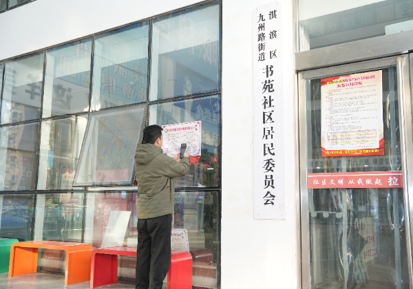 12月4日,在鹤壁市淇滨区九州路街道书苑社区居委会门口,居民正在扫描“矛盾纠纷受理平台”二维码。董海龙 摄