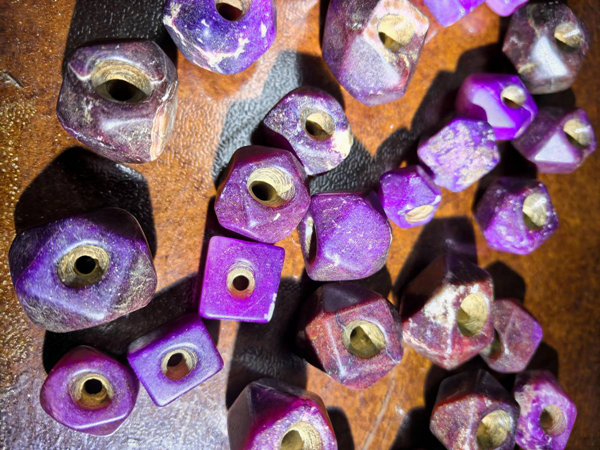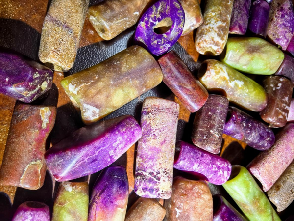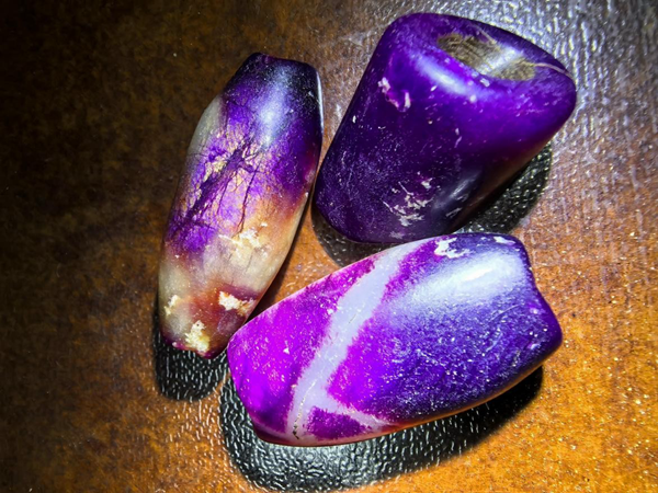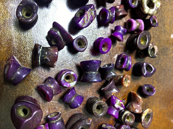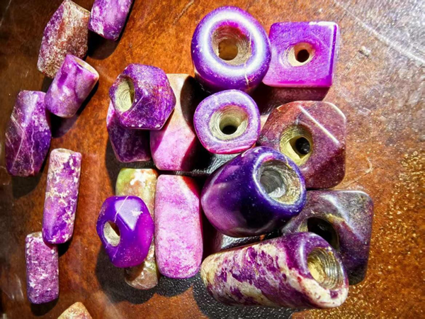 刘一田说,舒俱徕石在史前至先秦就已有初级加工技术。云南海门口遗址出土的舒俱来石吊坠,边缘保留有连续的琢痕,孔径呈喇叭状,采用的是“线切割 + 管钻”工艺,与同时期玉石加工技术一脉相承。这种加工方式在良渚文化紫石珠上同样存在,表明先民已掌握针对舒俱来石硬度(5.5-6.5)的适配性加工方法。值得注意的是,这些史前饰品多选择颜色均匀的皇家紫品种,反映出先民对石材品质的早期认知。