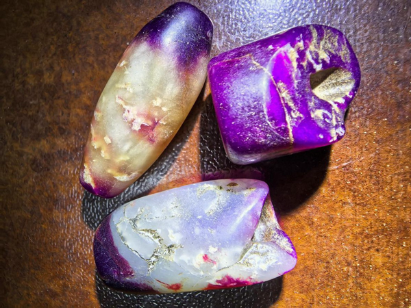 刘一田说,更早的线索出现在浙江良渚文化遗址群。余杭反山 M12 墓葬出土的串饰中,夹杂着 2 颗不规则紫色石珠,表面保留原始琢磨痕迹。尽管未进行成分检测,但从其“深紫底色含白色云雾纹”的外观特征来看,与现代樱花种舒俱来石的纹理特征高度相似。良渚文化以玉礼器体系发达著称,这类紫色石饰与玉琮、玉璧同出,暗示其在当时已具备特殊的礼仪价值。