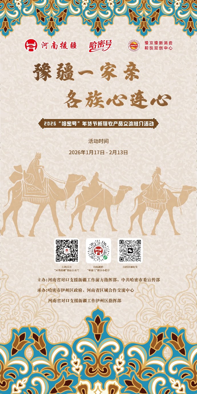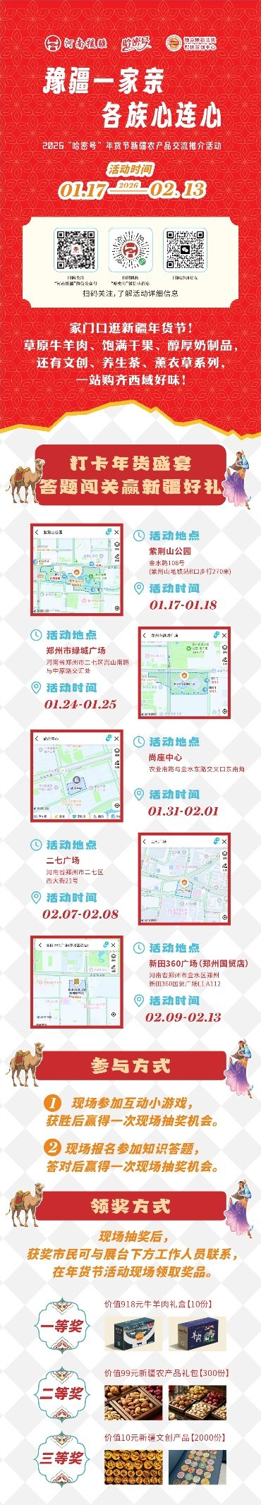 春节临近,年味渐浓!2026“哈密号”年货节携重磅福利登陆郑州,趣味互动+惊喜抽奖双重加码,一等奖“冰碴驹俐”山羊、二等奖新春大礼包、三等奖新疆特色围巾等你来拿!这份超全参与攻略赶紧码住,轻松解锁地道新疆年味与幸运惊喜~