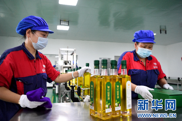 工作人员在光山县一家油茶加工企业的灌装车间作业。(新华社记者郝源 摄)