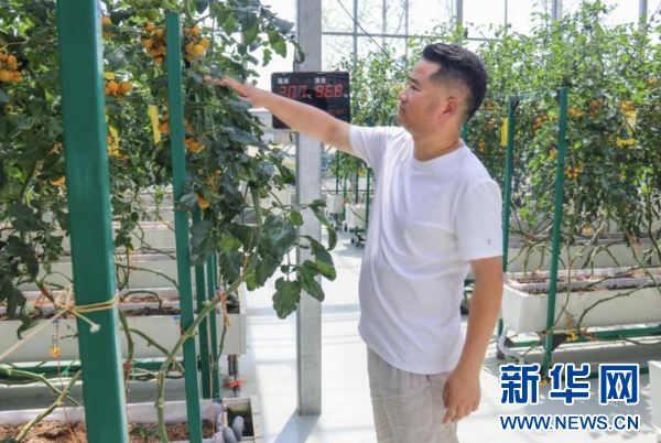 图为蔡振启在龙港湾智慧农业产业园查看水果番茄生长情况。(受访者供图)