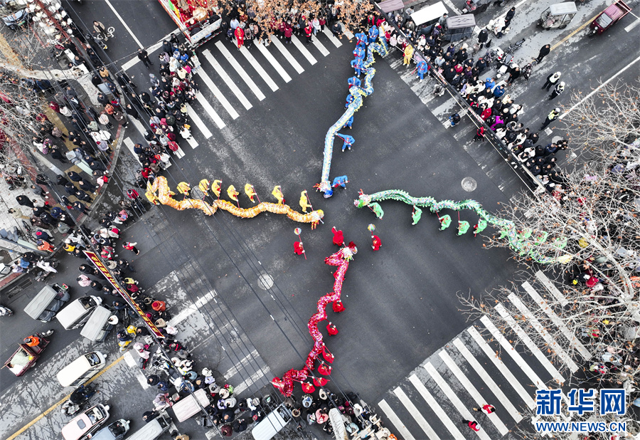 3月2日,游客在河南省济源市济水街道观看舞龙表演(无人机照片)。新华社发(苗秋闹 摄)