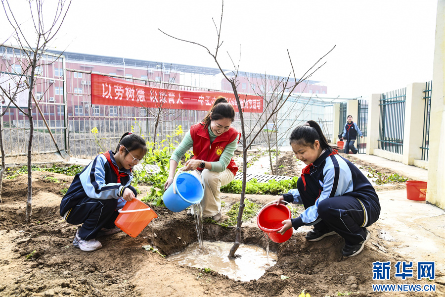3月11日,在河南省济源市轵城镇中王村中心小学,学生与老师一起为刚栽植的树苗浇水。新华社发(苗秋闹 摄)