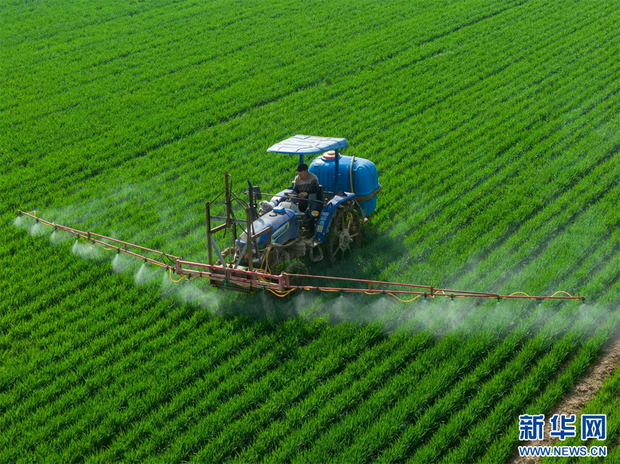 3月25日,河南省三门峡市灵宝市西阎乡西古驿村农民在麦田进行“一喷三防”作业(无人机照片)。新华社发(杜杰 摄)