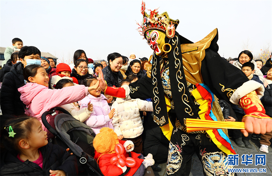 2月10日,在河南省周口市川汇区关帝庙广场,进行表演的民间艺人与观众互动。新华社发(高建中 摄)