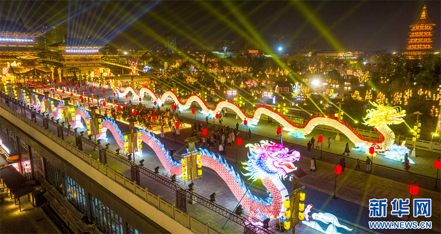 2月12日,游客在河南省洛阳市隋唐洛阳城九洲池景区赏灯游玩(无人机照片)。新华社发(张怡熙 摄)