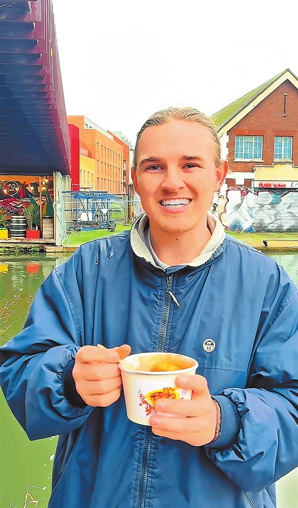 每天走进店里的,大多是留学生。他们从英国各地赶来,只为一解乡愁。也有不少慕名而来的外国人,刘小超总会热情招呼:“伦敦常年下雨,又湿又冷,来吃一碗火辣的胡辣汤吧,保准让你从头暖到脚,清爽无比!”