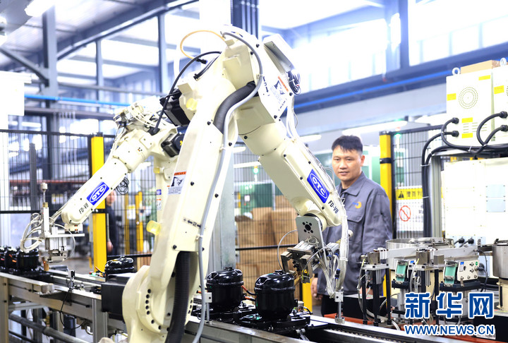 4月9日,在位于商丘市民权县的河南阿斯贝拉制冷有限公司生产车间,工人在生产流水线上进行装配作业。(魏文慧 摄)