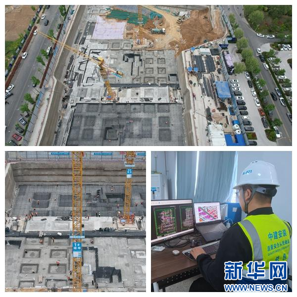 4月8日,在中建安装承建的郑州中原小微企业园项目现场,BIM工程师与施工团队实时联动,对施工进行实时监测与纠偏(拼版图片)。(史嘉豪 谭浩强 摄)