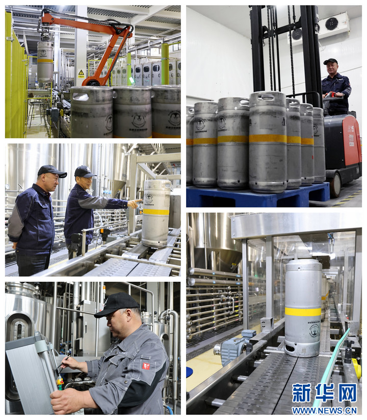 4月10日,在位于新乡市原阳县先进制造业开发区的河南骑仕精酿啤酒有限公司,工人正在生产线上作业(拼版图片)。(朱新国 摄)