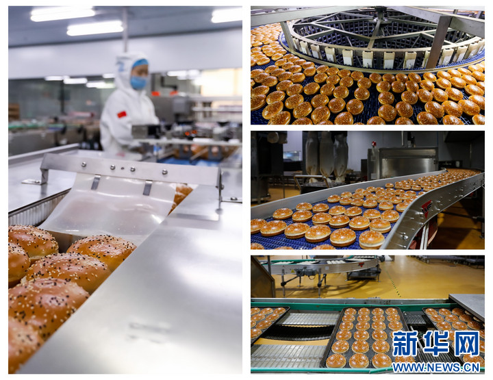 4月7日,在位于河南省焦作市武陟县乔庙镇的麦王食品(焦作)有限公司自动化生产车间,工作人员在生产汉堡胚(拼版图片)。(王琳锋 摄)