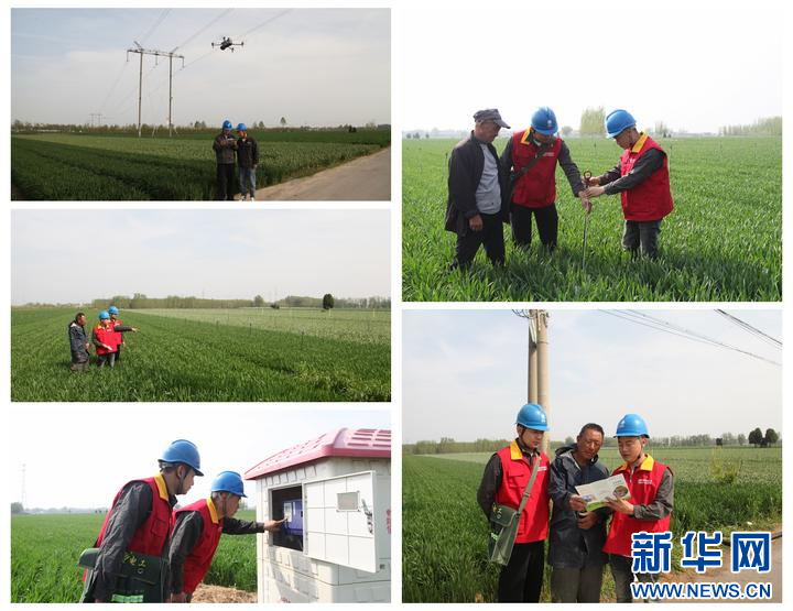 4月7日,在商丘市宁陵县,国网宁陵县供电公司工作人员为农户讲解农田灌溉安全用电知识、帮助检查灌溉设施及高标准农田配套设备,并开展无人机红外测温与巡视工作(拼版图片)。(刘学威 摄)