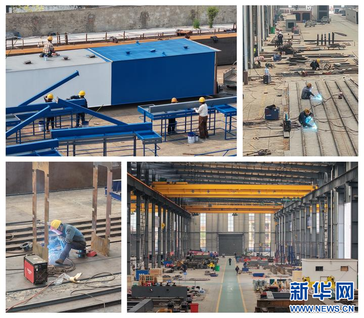 4月7日,在位于新乡市封丘县的河南海泰重工有限公司厂区,工人在进行焊接、行车吊装等加工作业(拼版图片)。(张亚冰 摄)
