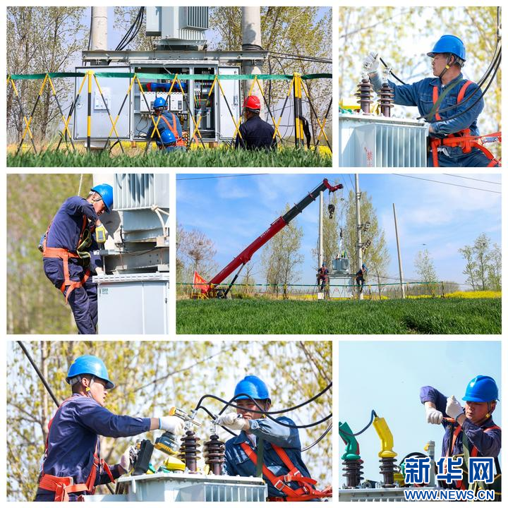 4月3日,国网濮阳供电公司工作人员在濮阳市范县10千伏瑞5号崔楼线东路庄台区改造变压器及配电盘(拼版图片)。(卢莎莎 摄)