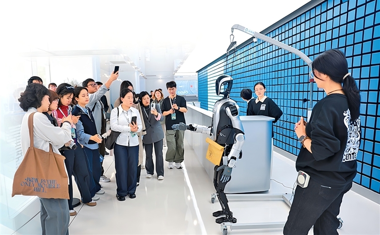 这里还是全国第三个具备异构人形机器人训练能力的场地。140台人形机器人在训练师“手把手”指导下,在27个高度逼真的场景中“上课”。“原来机器人也像人一样,需要不断地训练、学习、进步。”北京日报国际传播部记者王雅晴说,北京刚刚举办了人形机器人半程马拉松,机器人的奔跑速度提升惊人,产业发展大有可为。