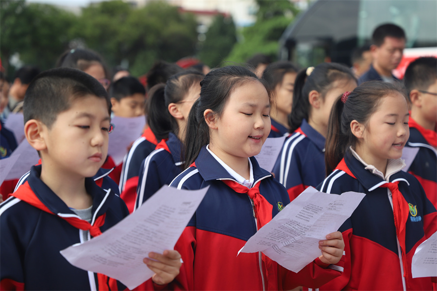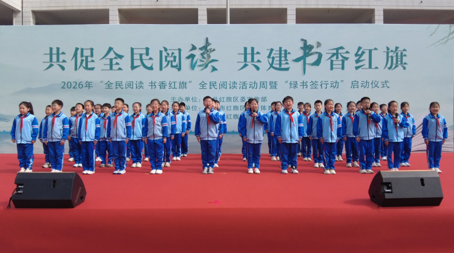 4月22日,在河南省新乡市红旗区和平路小学,学生们在2026年“全民阅读 书香红旗”暨“绿书签行动”启动仪式上齐诵《少年中国说》(节选)。(张洁 摄)