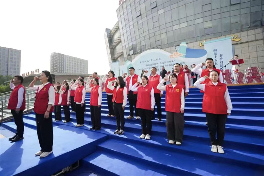 4月20日,河南省郑州市巩义市“全民阅读活动周”暨公共图书馆服务宣传周主题活动上,来自巩义市图书馆及20个基层分馆的负责人以读书志愿者身份进行宣誓。(康泽 摄)