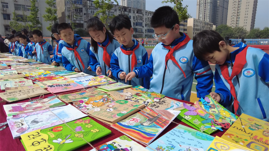 4月22日,在河南省新乡市红旗区和平路小学,学生们在2026年“全民阅读 书香红旗”暨“绿书签行动”启动仪式上参观“名著封面创意设计”作品展。(张洁 摄)