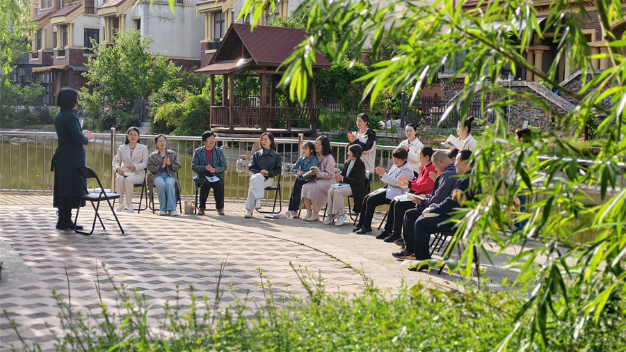 4月21日,在河南省三门峡市陕州区大营镇永昌社区,“微光读书会”成员正在进行阅读分享活动。(王青伟 摄)