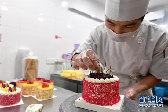 烘焙师在郑州一家蛋糕店内制作车厘子蛋糕(12月6日摄)。 新华社记者 李嘉南 摄