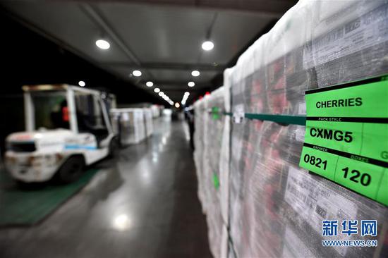 工作人员在郑州新郑国际机场西货站搬运车厘子(12月8日摄)。 新华社记者 李嘉南 摄
