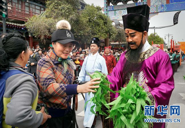 4月2日,扮演“包公”的演员在巡游中按传统清明习俗向市民和游客“赠柳”。新华社记者 李安 摄