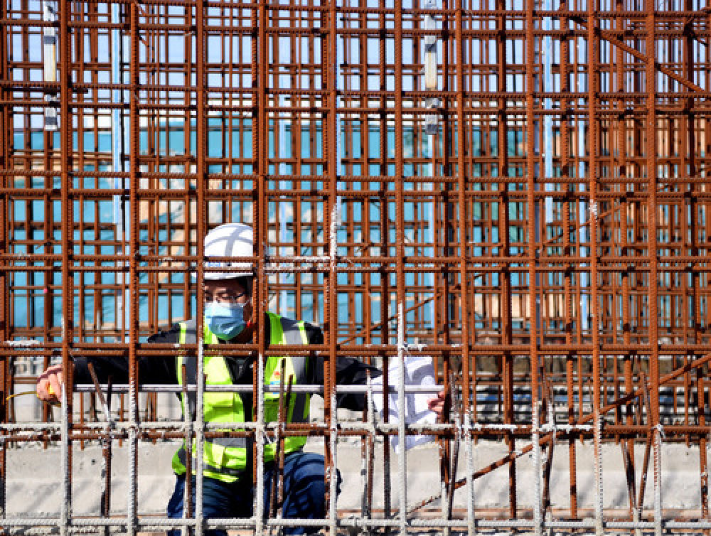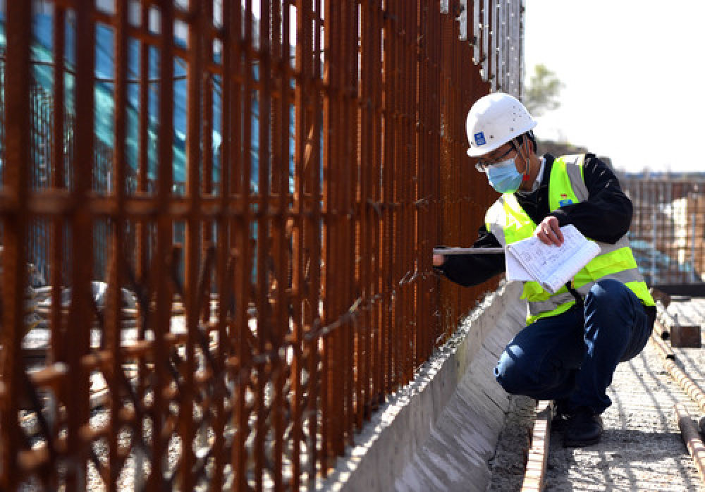 梁少智在郑州市经开区滨河国际新城市政工程项目工地验收钢筋绑扎情况(3月10日摄)。新华社记者 李嘉南 摄