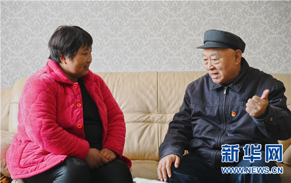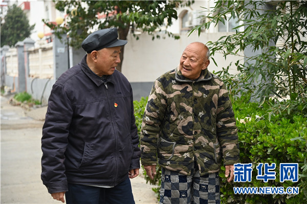 3月11日,赵化录(左)与冀屯镇益三村村民交流。新华社记者 张浩然 摄