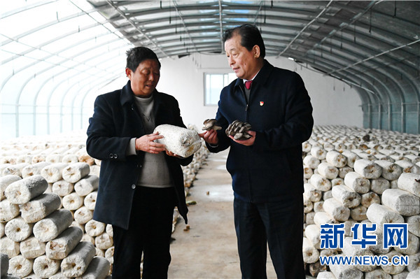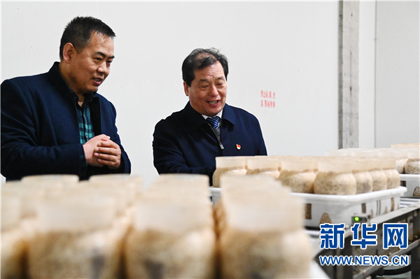 3月11日,赵化录(右)走访冀屯镇食用菌园区示范基地。新华社记者 张浩然 摄