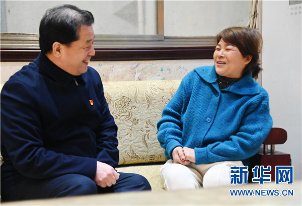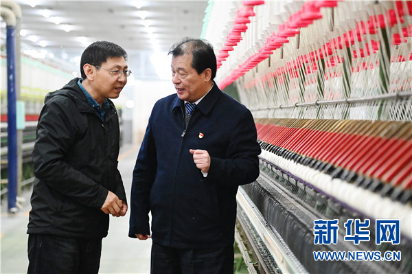 3月12日,赵化录(右)走访了解辉县市华兴纺织有限公司生产经营情况。新华社记者 张浩然 摄