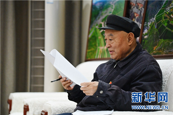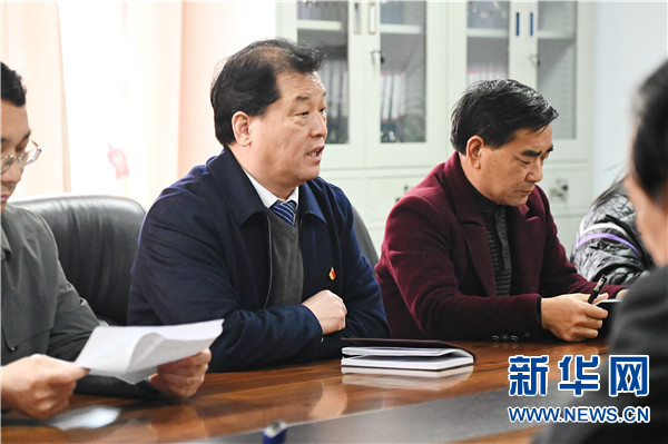 3月10日,吴金印在唐庄镇政府会议室学习文件。新华社记者 张浩然 摄