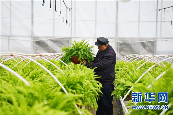 3月11日,吴金印查看唐庄镇大棚花卉生长情况。新华社记者 张浩然 摄