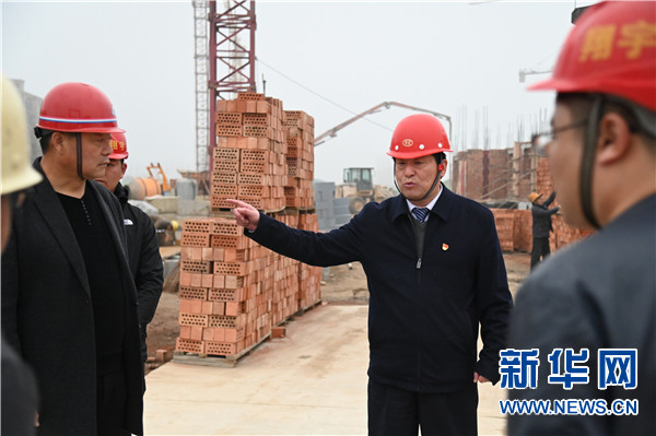 3月12日,在冀屯镇冀祥社区建设工地,赵化录(右二)强调保证工程质量和进度的重要性。新华社记者 张浩然 摄