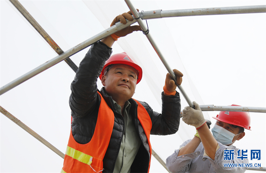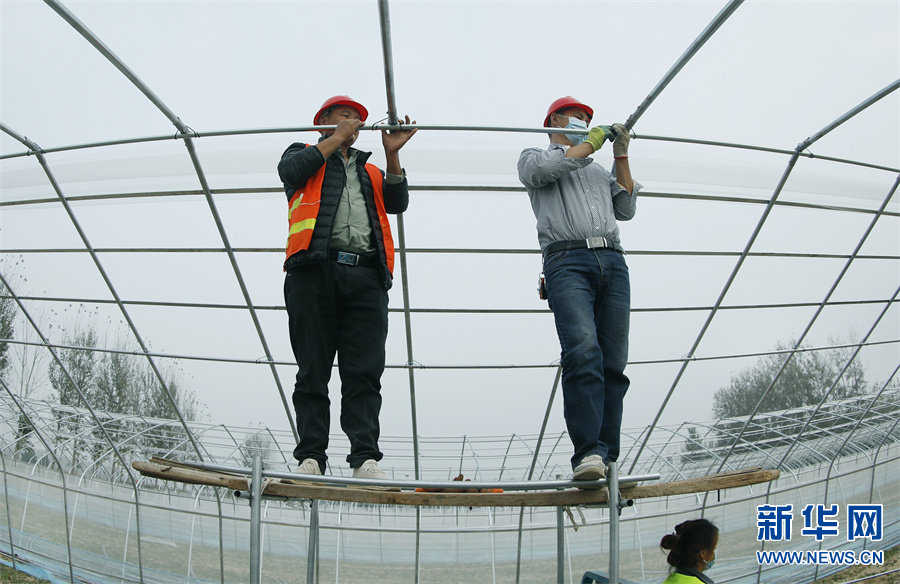 11月1日,河南省开封市尉氏县,工人们在水坡镇仝家村的蔬菜种植基地搭建钢构大棚。
