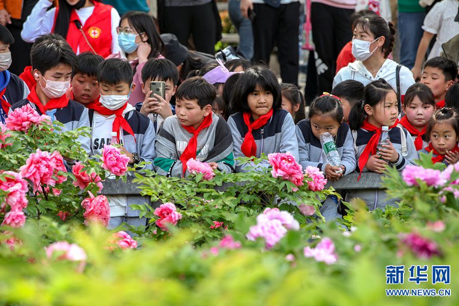 4月9日,河南省洛阳市王城公园,一群小学生在观赏盛开的牡丹。