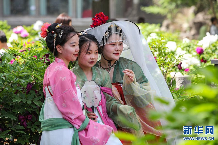 4月9日,河南省洛阳市王城公园,几位身着汉服的游客在牡丹花丛中拍照。