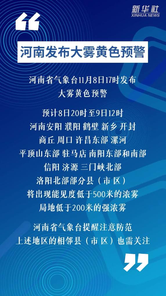 "新华社郑州10月25日电(记者马意翀)河南省气象台25日17时发布大雾黄色预警:预计25日20时至26日12时,河南安阳东部、濮阳、鹤壁东部、新乡东部、郑州东部和南部、开封、商丘、平顶山东部、许昌、漯河、周口、南阳东部、驻马店、信阳西部、三门峡南部部分县(市、区)将出现能见度低于500米的浓雾。"