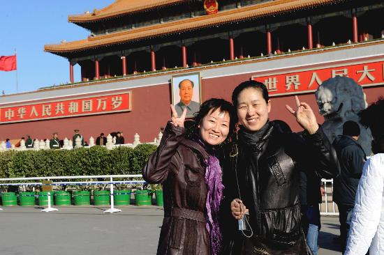 两位游客在天安门前合影