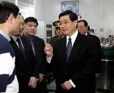4月20日,中共中央总书记、国家主席胡锦涛在北京考察军事医学科学院微生物流行病研究所和中国科学院北京基因组研究所。